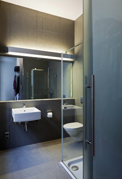 Durch den Einbau schalldämmender Funktionstrennwände wurde aus der Vierzimmer- eine Sechszimmerwohnung. Im ehemalige Arbeitszimmer wurde ein zweites Bad und ein Schrank- bzw. Ankleideraum eingebaut und so das Elternschlafzimmer geschaffen.